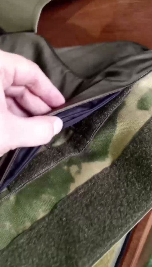В данном модели напашника в карманах под баллистическую защиту имеются специальные клапана, которые позволяют вставить бронепанели по всей площади