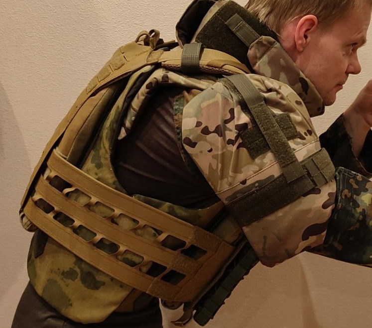 Эргономичная форма наплечника дает хорошее облегание плеч, комфортность использования, а также уменьшенную площадь от поражения осколками.