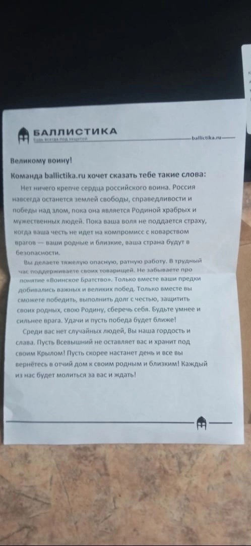 АлексейОгромная Благодарность коллективу "Баллистика"! Заказывали комплект баллистики из СВМПЭ с чехлами (жилет, наплечники, пятиточечник, защита шеи и паха), дополнительно к жилету быстросбросы, капы. Все заказывали для товарища уже находящемуся на СВО. Прекрасный менеджер проконсультировала, дала дельные советы и еще перезвонила, чтоб ничего не упустить. Ну думаем ждать долго придется, но нет! 7 дней и посылку забираем в транспортной компании. Приготовились к увлекательному пазлу по распределению баллистики по чехлам, как оказалось, все уже в сборе! Вот этого никак не ожидали! Касательно снаряжения: все на высоте! В общем, были приятно удивлены такому внимательному подходу к делу. На сайте можно найти все необходимое и быть уверенным в надежной и качественной продукции, которую доставят в кратчайшие сроки.