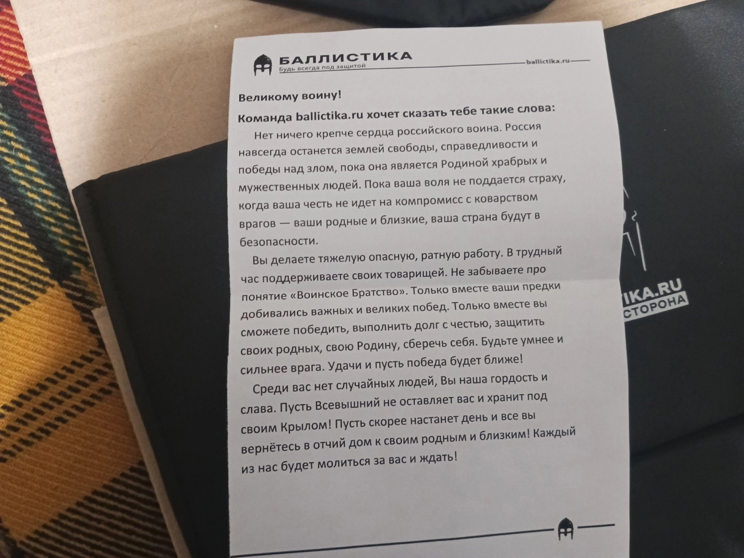 ДмитрийХочу выразить слова благодарности команде BALLICTIKA.RU. Использую Вашу баллистику с 2022 года, качество лучшее что можно найти на рынке мягкой брони, очень быстро отправляют заказ, больше недели ни разу не ждал, даже в период мобилизации, когда на подобную продукцию спрос был огромный, широкий выбор, это важно. Баллистика стоит в двух бронях(Ars arma сканда А-18, А-22), поясе (jaeger equipment омега), пятиточичнике (wolf pack большой), пах (Ars arma клевер), шея (Ars arma горжет).